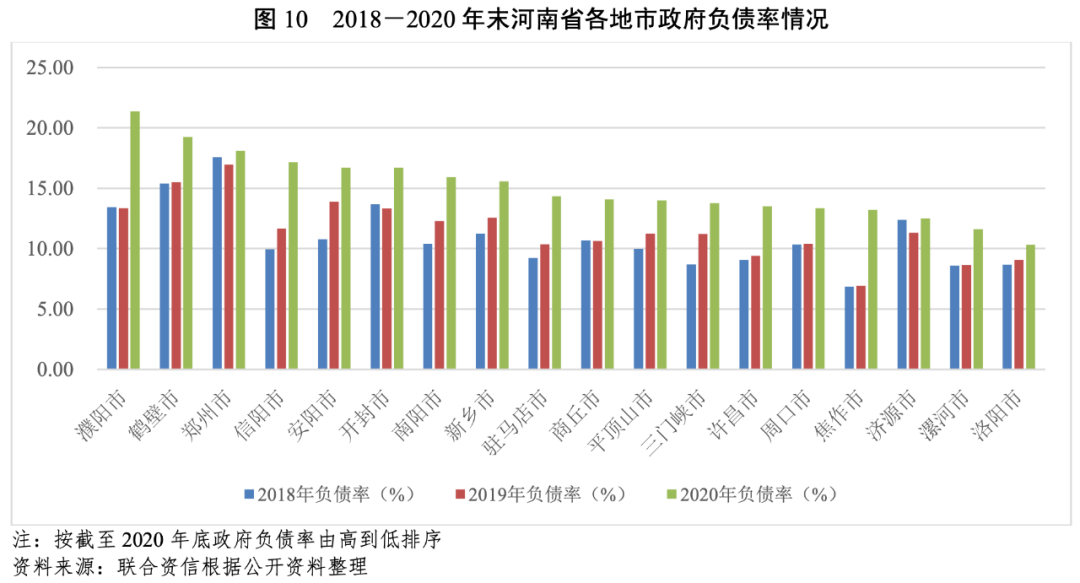 債務(wù)負(fù)擔(dān)方面,截至2020年底,河南省各地市政府負(fù)債率均較上年底有所提高,其中濮陽市負(fù)債率增幅最大,較上年底上升8.02個百分點。截至2020年底,濮陽市政府負(fù)債率最高,為21.37%,洛陽市政府負(fù)債率最低,為10.32%,其余地市政府負(fù)債率在11.00%~20.00%之間不等。整體看,河南省各地市政府債務(wù)負(fù)擔(dān)處于尚可或較輕水平。