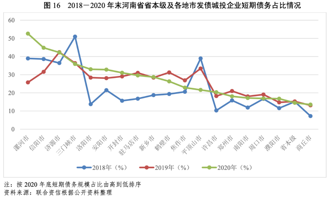 從發(fā)債城投企業(yè)全部債務(wù)與“發(fā)債城投企業(yè)全部債務(wù)+地方政府債務(wù)”的比值看,截至2020年底,9個地市比值超過50%,其中,鄭州市和三門峽市比值分別為70.19%和69.45%,整體處于較高水平。