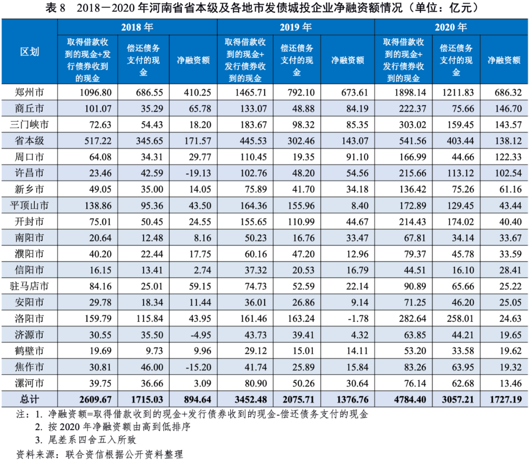 從河南省發(fā)債城投企業(yè)對外融資情況來看,考慮到政府注資、往來拆借等行為可能對城投企業(yè)融資活動現(xiàn)金流入及流出產(chǎn)生擾動影響,本報告利用“取得借款收到的現(xiàn)金+發(fā)行債券收到的現(xiàn)金”來表示城投企業(yè)從金融機構(gòu)及債券市場進(jìn)行融資形成的現(xiàn)金流入,利用“償還債務(wù)支付的現(xiàn)金”來表示城投企業(yè)償還剛性債務(wù)形成的現(xiàn)金流出,更為直觀地體現(xiàn)了城投企業(yè)自身融資能力以及金融機構(gòu)及債券市場對城投企業(yè)的認(rèn)可度。2018-2020年,河南省發(fā)債城投企業(yè)“取得借款收到的現(xiàn)金+發(fā)行債券收到的現(xiàn)金”呈現(xiàn)快速增長態(tài)勢,年均復(fù)合增長35.40%。具體來看,鄭州市發(fā)債城投企業(yè)“取得借款收到的現(xiàn)金+發(fā)行債券收到的現(xiàn)金”規(guī)模遠(yuǎn)大于省本級及其他地市,2020年達(dá)1898.14億元,占全省總計的39.67%;省本級發(fā)債城投企業(yè)“取得借款收到的現(xiàn)金+發(fā)行債券收到的現(xiàn)金”規(guī)模排名第二,2018-2020年呈波動增長趨勢;除駐馬店市發(fā)債城投企業(yè)“取得借款收到的現(xiàn)金+發(fā)行債券收到的現(xiàn)金”規(guī)模呈波動增長趨勢以外,其他地市發(fā)債城投企業(yè)“取得借款收到的現(xiàn)金+發(fā)行債券收到的現(xiàn)金”規(guī)模均持續(xù)增長,其中,許昌市、焦作市、安陽市和鶴壁市發(fā)債城投企業(yè)“取得借款收到的現(xiàn)金+發(fā)行債券收到的現(xiàn)金”規(guī)模2020年增幅顯著,同比分別增長109.86%、99.50%、97.88%和82.68%;僅漯河市發(fā)債城投企業(yè)“取得借款收到的現(xiàn)金+發(fā)行債券收到的現(xiàn)金”規(guī)模2020年同比有所下降。2018-2020年,河南省發(fā)債城投企業(yè)“償還債務(wù)支付的現(xiàn)金”規(guī)模持續(xù)增長,年均復(fù)合增長率為33.51%,略低于“取得借款收到的現(xiàn)金+發(fā)行債券收到的現(xiàn)金”年均復(fù)合增長率。具體來看,省本級、周口市、平頂山市、濮陽市、信陽市和焦作市發(fā)債城投企業(yè)“償還債務(wù)支付的現(xiàn)金”規(guī)模呈波動增長趨勢,其他地市發(fā)債城投企業(yè)“償還債務(wù)支付的現(xiàn)金”規(guī)模均持續(xù)增長,其中,焦作市、許昌市、周口市、鶴壁市和南陽市發(fā)債城投企業(yè)“償還債務(wù)支付的現(xiàn)金”規(guī)模2020年出現(xiàn)大幅增長,同比增幅均超過100%;信陽市、平頂山市和濮陽市發(fā)債城投企業(yè)“償還債務(wù)支付的現(xiàn)金”規(guī)模2020年同比有所下降。2018-2020年,河南省發(fā)債城投企業(yè)凈融資額持續(xù)為正,凈流入規(guī)模年均復(fù)合增長38.95%。具體來看,除許昌市、洛陽市、濟(jì)源市和焦作市于2018年或2019年出現(xiàn)發(fā)債城投企業(yè)凈融資額為負(fù)的情況以外,省本級及其他地市發(fā)債城投企業(yè)凈融資額于2018-2020年均持續(xù)為正。其中,平頂山市、濟(jì)源市、安陽市和濮陽市發(fā)債城投企業(yè)凈融資額2020年增長顯著,同比增幅均超過100%;漯河市、開封市和省本級發(fā)債城投企業(yè)2020年凈融資額同比有所下降。總體來看,河南省發(fā)債城投企業(yè)2020年融資狀況較2019年有所改善,凈融資額持續(xù)增長。