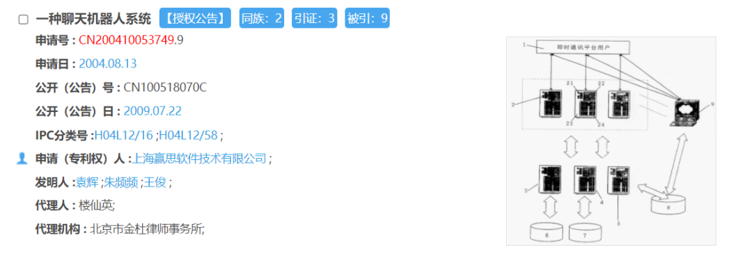 據了解,小i機器人隸屬上海智臻智能網絡科技股份有限公司,而上述“ZL200410053749.9”這一編號則是名為“一種聊天機器人系統(tǒng)”的專利。