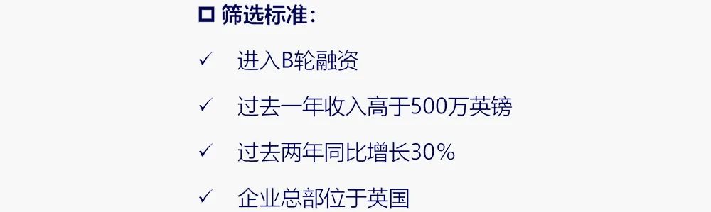 成長(zhǎng)企業(yè):進(jìn)入該階段的企業(yè)會(huì)進(jìn)入「未來五十」計(jì)劃階段,未來五十指:扶持在英國進(jìn)入B輪融資發(fā)展最快的50家科創(chuàng)企業(yè),英國政府每年為企業(yè)量身定制扶植計(jì)劃,幫助其發(fā)展。