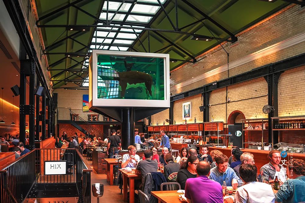 如最具藝術(shù)館氣質(zhì)的烤雞餐廳Tramshed,由藝術(shù)家Damien Hirst參與設(shè)計(jì),是人們必去打卡地,其地下室設(shè)置成展覽、會(huì)議空間。