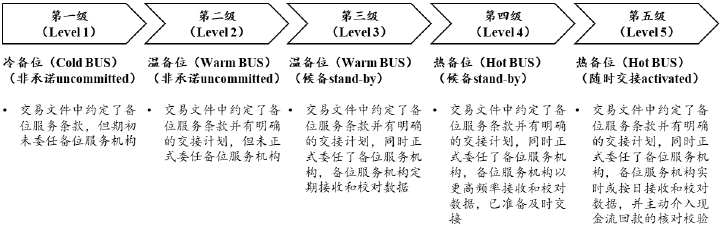 國(guó)際證券化市場(chǎng)參照信息科技學(xué)中的專(zhuān)業(yè)術(shù)語(yǔ),根據(jù)服務(wù)商的接替工作準(zhǔn)備到位程度(Readiness)的不同,把“備位服務(wù)”進(jìn)一步區(qū)分為“熱備位(Hot BUS)、溫備位(Warm BUS)、冷備位(Cold BUS)”,具體含義如下: