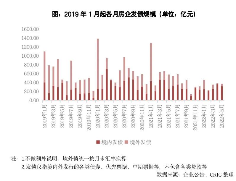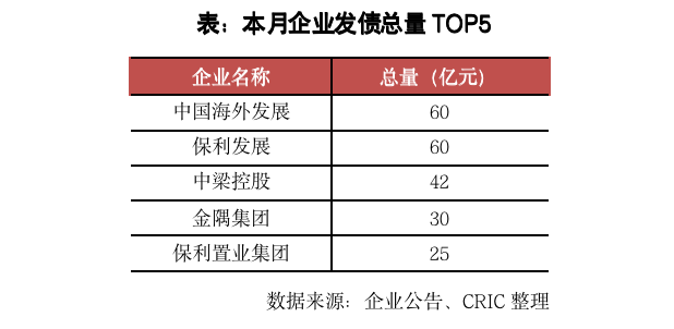 5月房企發債375.07億元,環比增加0.6%,同比減少35.2%。其中,境外發債約61.07元,環比增加366.9%,同比減少80.9%,主要是因為4月僅有遠洋集團發行了一筆2億美元的綠色票據,而本月則有中梁和大唐因為交換要約而發行了3筆優先票據。境內發債314億元,環比減少12.7%,同比增加21.1%,其中,公司債發行145億元,環比減少20%,同比增加50.3%;中期票據發行93億元,環比增加2.7%,同比減少23.4%;融資券發行30億元,環比減少65.9%,同比減少25%,境內發債主體仍然基本為央企國企。