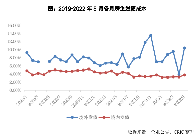 2022年5月100家典型房企新增債券類融資成本4.81%,環比上升1.55pct,同比下降0.4pct。其中境內融資成本3.73%,環比上升0.5pct,發債主體仍是集中在中海、保利發展、華潤置地等國企央企;境外融資成本為10.38%,環比大幅提升了6.58pct,主要是因為上個月僅有遠洋集團發行了一筆成本較低的綠色債券,而本月則有中梁和大唐因為交換要約發行了3筆優先票據,融資成本都相對較高。2022年截至5月100家典型房企新增債券類融資成本4.39%,較2021年全年下降0.89個百分點,其中境外債券融資成本7.98%,較2021年全年上升0.96個百分點,境內債券融資成本3.35%,較2021年全年下降0.71個百分點。
