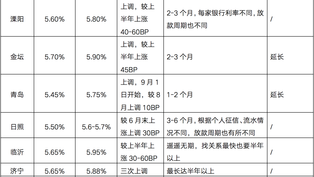 綜合來看,3-6個月的放款周期已成為常態,臨沂、濟寧、菏澤等山東地市放款周期高達半年以上,還有部分諸如蘇州、泰州、鹽城等信貸端全面收緊,放款時間不定。