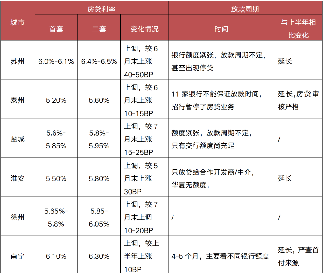 比如,蘇州目前首套房房貸利率在6.0%-6.1%之間,較6月末上漲40-50BP,與此同時,銀行額度緊張,放款周期不定,甚至部分銀行出現“停貸”。