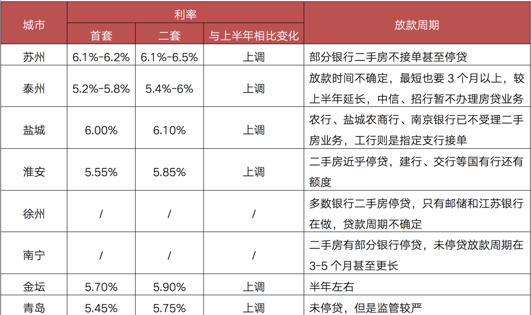 還有泰州,當地某大行工作人員表示,目前泰州首套房房貸利率普遍在5.20%,二套房利率為5.60%,較6月末上漲10-15BP。根據CRIC調研,目前共有11家銀行不能保證放款時間,其中,招行已暫停了房貸業務。